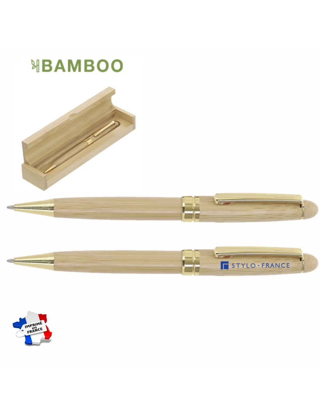 Stylo personnalisé raffiné conçu à partir d’un mélange de bambou naturel et d’éléments métalliques à finition dorée. Il dispose d’un mécanisme rotatif et d’une encre bleue, et est présenté dans un élégant étui en bambou.